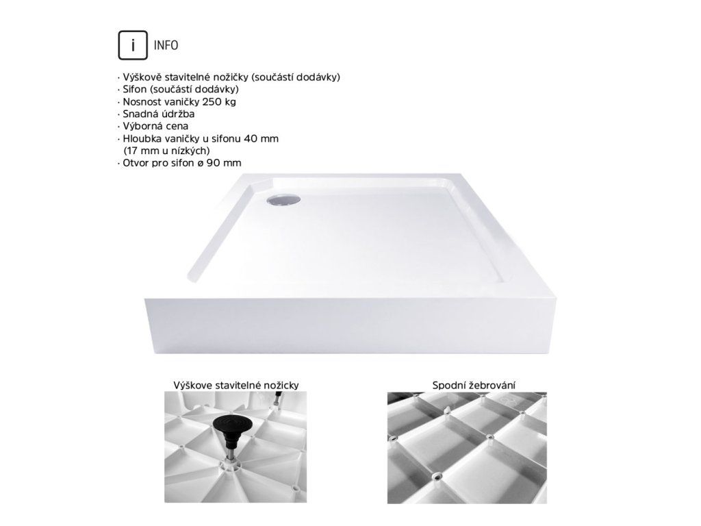 Dno vaničky je zpevněno žebrováním a nosnost vaničky je 250 kg. Vanička je dodávána spolu s nožičkami a sifonem.