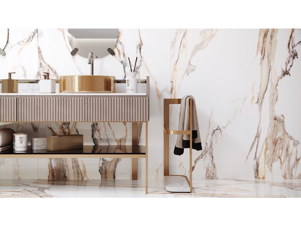 Vhodný výběr formátu dlaždic kolekce Calacatta Gold umožní dosáhnout dojem jednotného povrchu připomínajícího monolitický blok mramoru.