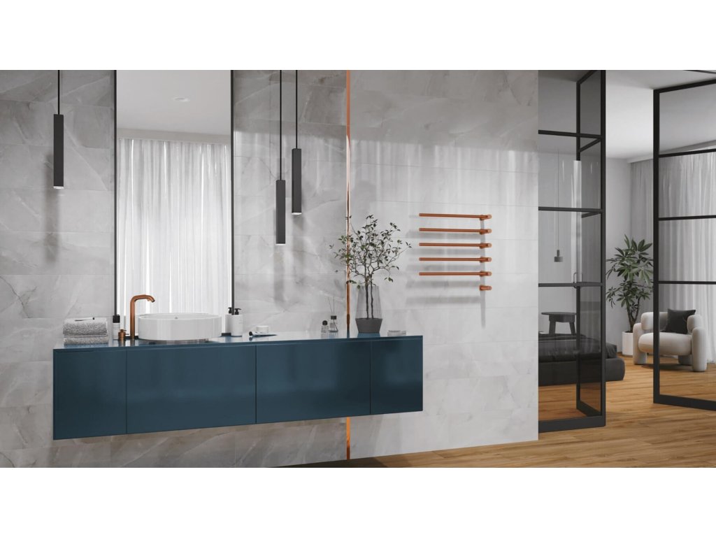 Jedná se o kolekci obkladů ve dvou odstínech šedé. Základní obklady Cesaria mají lesklý povrch se vzorem přírodního kamene. Kombinace surovosti kamene s měděnými doplňky v podobě lišt a mozaiky působí zajímavě. Navzdory zdání se nejedná o samozřejmou kombinaci. Syrová šedá barva kamene přerušovaná teplou mědí činí interiér moderním a nadčasovým.