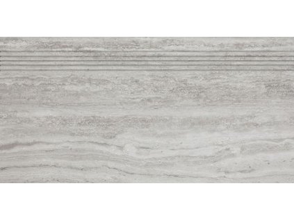 Schodovka RAKO v šedé barvě s rozměry 30x60 cm a tloušťkou 10 mm nabízí povrch imitující mramor. Je glazovaná, matná a reliéfní, ideální pro použití na schodech s...