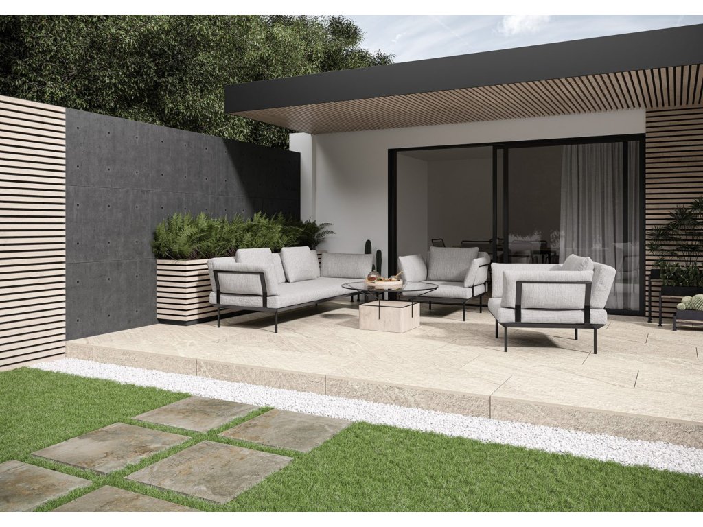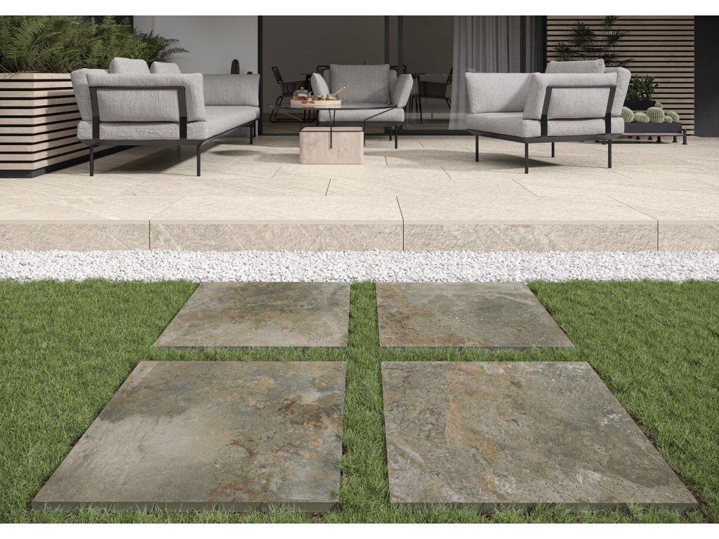 Univerzální povaha obkladů z kolekce Testo umožňuje vytvářet neobvyklé kompozice mimo jiné s využitím štěrku a rostlin.