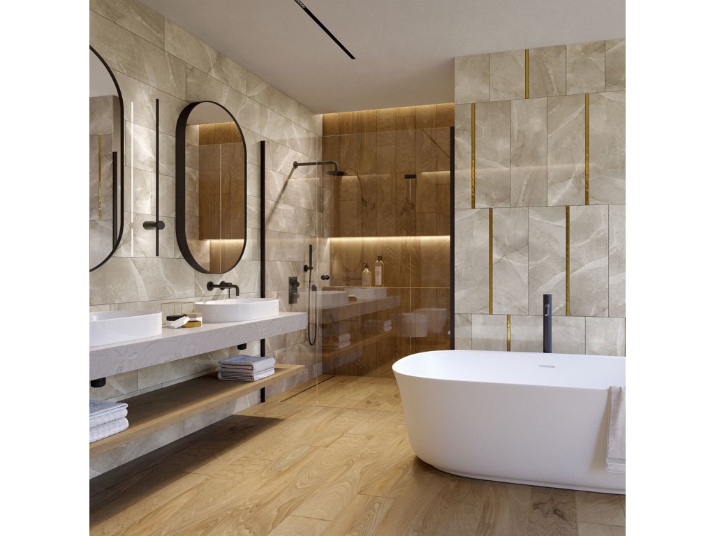 Obklady Venis Bianca mají design přírodního šedého kamene. Kombinace syrovosti kamene se zlatými doplňky v podobě lišt a mozaik působí elegantně a moderně. Surový studený kámen v kombinaci s teplým zlatem dodá interiéru nadčasovost a zajímavost.