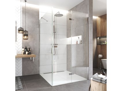 Hliníkové profily v barvě chrom, sklo Čiré, síla skla 6 mm, obdélník, 900 (dveře) x 900 (pevný díl), výška 2000 mm.