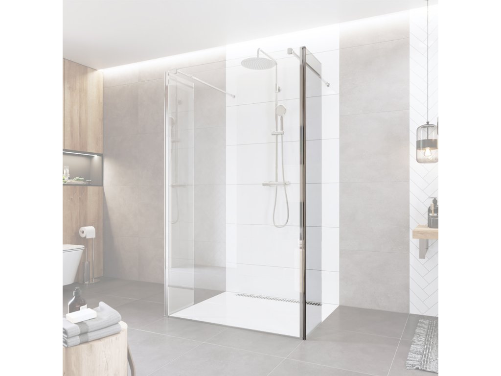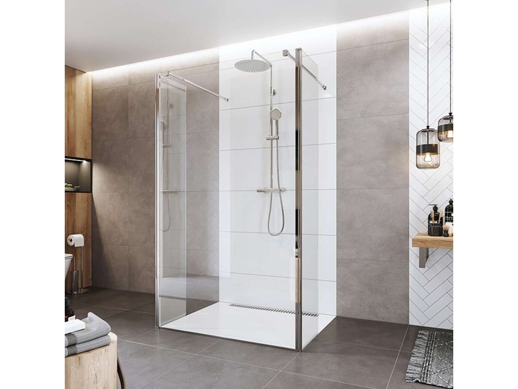 Sprchové stěny WALK IN jsou jediné, které se vám opravdu přizpůsobí. Sestavte si svůj sprchovací prostor na míru. Sprchový kout typu WALK IN si můžete poskládat v několika možných kombinacích. Stabilitu bezpečnostní skla zajišťuje elegantní kovová vzpěra a v případě montáže na zeď i boční stavitelný profil, které nenarušují designovou čistotu celého koutu, nejedná se však o hermeticky uzavřený výrobek.
