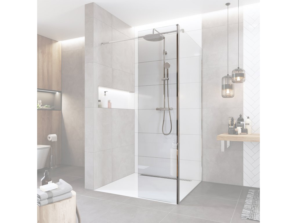 Sprchové stěny WALK IN jsou jediné, které se vám opravdu přizpůsobí. Sestavte si svůj sprchovací prostor na míru. Sprchový kout typu WALK IN si můžete poskládat v několika možných kombinacích. Stabilitu bezpečnostní skla zajišťuje elegantní kovová vzpěra a v případě montáže na zeď i boční stavitelný profil, které nenarušují designovou čistotu celého koutu, nejedná se však o hermeticky uzavřený výrobek.
