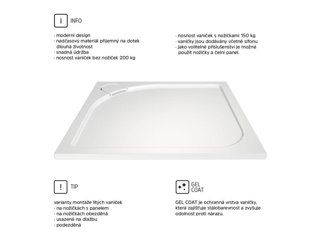 Sprchové vaničky jsou podstatnou součástí sprchových koutů a svým designem a kvalitou zpracování mohou výrazně ovlivnit celkový dojem ze sprchového koutu.Sprchové vaničky z litého mramoru jsou opatřeny ochrannou vrstvou Gelcoat, která zajišťuje stálobarevnost a odolnost proti nárazu.