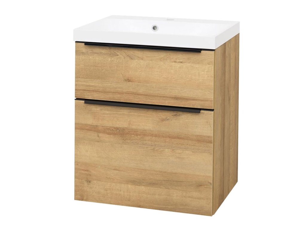 Mereo Mailo, koupelnová skříňka s umyvadlem z litého mramoru 61 cm, dub Riviera, černé madlo