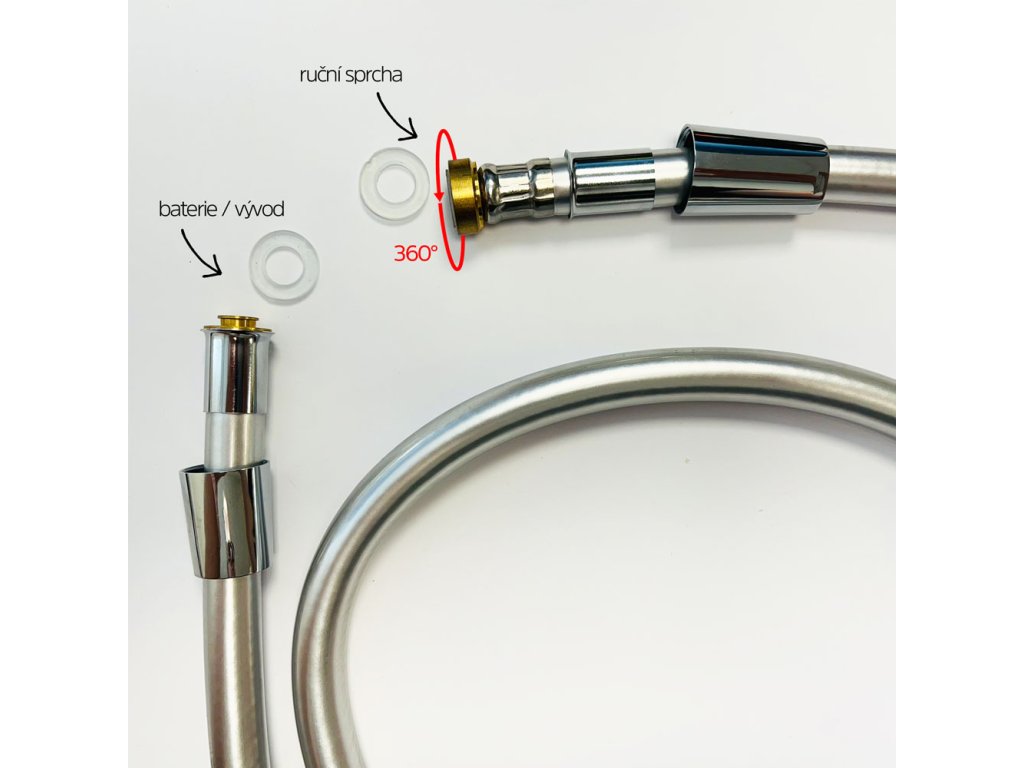 - Anti-twist: systém proti překroucení hadice - umístěný na straně s delším kónusem, montuje se na ruční sprchu