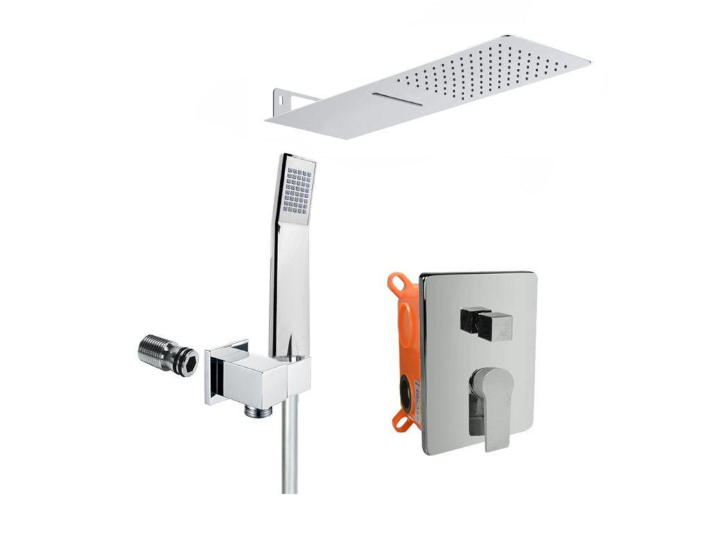 Součástí setu je talířová sprcha s vodopádem 500x200 mm, držák sprchy, jednopolohová sprcha, plastová šedostříbrná hadice 150 cm, stěnový vývod.
