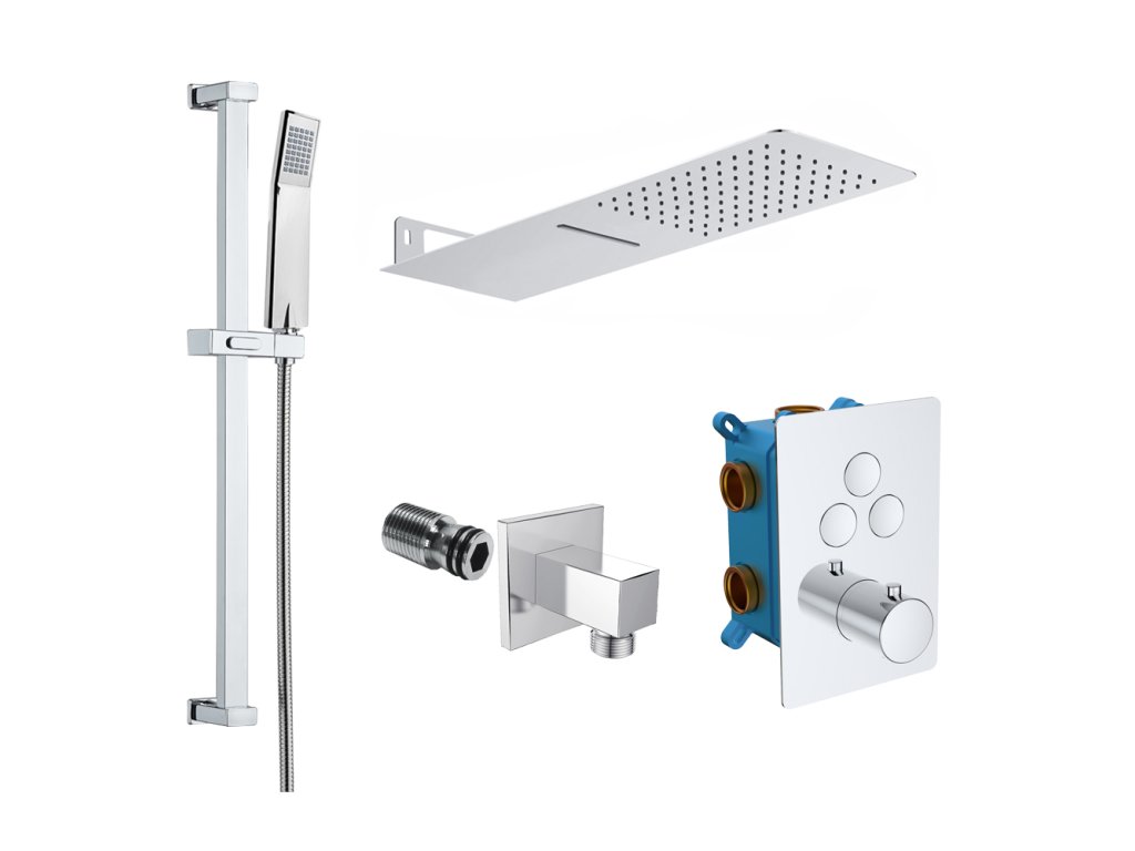 Součástí setu je talířová sprcha s vodopádem 500x200 mm, posuvný držák, jednopolohová sprcha, dvouzámková nerez hadice 150 cm, stěnový vývod.