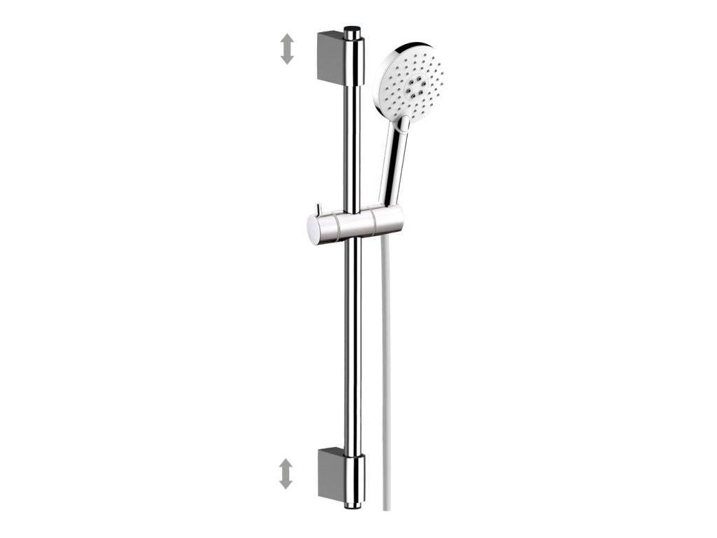 Sprchová souprava se vyznačuje moderním designem, vysokou variabilitou a především umožňuje téměř libovolnou kombinaci s příslušenstvím sprchového programu. Sprchový set obsahuje ruční sprchovou hlavici pěti polohami, stavitelný držák a šedostříbrnou hadici s plastovým potahem, o délce 150 cm a systémem zabraňujícím překroucení. Hadice se montuje mezi baterii a sprchovou hlavici.Díky posuvnému jezdci si můžete výšku sprchy nastavit dle potřeby. Kotvící držáky nejsou pevně spojené s tyčí a je tedy možné je na tyči posunout a využít děr po předchozím držáku ve Vaší koupelně.