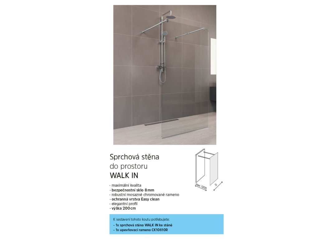 1x Sprchovou stěnu WALK IN (balení obsahuje sklo, boční profil, spodní lištu a 1x upevňovací rameno)