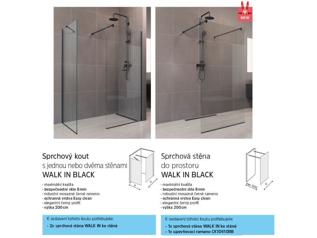 Sprchové stěny WALK IN jsou jediné, které se vám opravdu přizpůsobí. Sestavte si svůj sprchovací prostor na míru. Sprchový kout typu WALK IN si můžete poskládat v několika možných kombinacích. Stabilitu bezpečnostní skla zajišťuje elegantní kovová vzpěra a v případě montáže na zeď i boční stavitelný profil, které nenarušují designovou čistotu celého koutu, nejedná se však o hermeticky uzavřený výrobek.