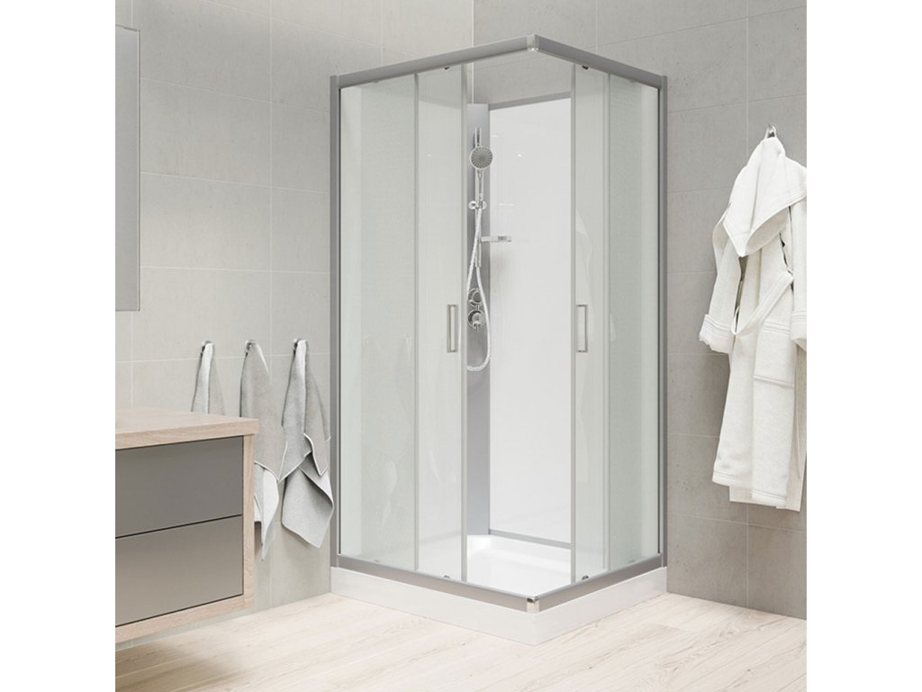 Sprchový box vnáší do ekonomické třídy nový rozměr kvality. Sklo je v designu Point, satin ALU profil. Tloušťka bezpečnostního skla je 5/4 mm. Sklo je dokonale utěsněno silikonovými lištami, nejedná se však o hermeticky uzavřený výrobek. Sprchový kout je osazen posuvnými dveřmi, které mají kvalitní dvojkolečkové horní pojezdy s možností perfektního seřízení. Dorazy zajišťují minimální nárazy při otevírání a zavírání sprchového koutu.Spodní pojezdy umožňují odklopení posuvné části sprchového koutu a vyčištění běžně nedostupných míst. Těsnost mezi pevnou a posuvnou částí je zajištěna stíracími a silikonovými lištami na obou dvou částech. K připojení boxu do vodovodního řádu je možné použít nerezové opletové hadičky, které naleznete také v naší nabídce (součástí balení jsou nerezové připojovací hadice 1/2" o délce 60 cm).