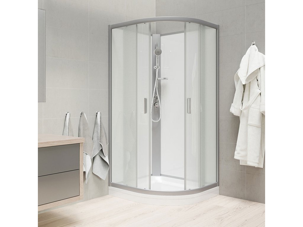 Sprchový box vnáší do ekonomické třídy nový rozměr kvality. Sklo je v designu Point, satin ALU profil. Tloušťka bezpečnostního skla je 4/4 mm. Sklo je dokonale utěsněno silikonovými lištami. Sprchový kout je osazen posuvnými dveřmi, které mají kvalitní dvojkolečkové horní pojezdy s možností perfektního seřízení. Dorazy zajišťují minimální nárazy při otevírání a zavírání sprchového koutu.Spodní pojezdy umožňují odklopení posuvné části sprchového koutu a vyčištění běžně nedostupných míst. Těsnost mezi pevnou a posuvnou částí je zajištěna stíracími a silikonovými lištami na obou dvou částech, nejedná se však o hermeticky uzavřený výrobek.