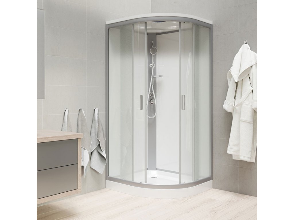 Sprchový box vnáší do ekonomické třídy nový rozměr kvality. Sklo je v designu Point, satin ALU profil. Tloušťka bezpečnostního skla je 4/4 mm. Sklo je dokonale utěsněno silikonovými lištami. Sprchový kout je osazen posuvnými dveřmi, které mají kvalitní dvojkolečkové horní pojezdy s možností perfektního seřízení. Dorazy zajišťují minimální nárazy při otevírání a zavírání sprchového koutu.Spodní pojezdy umožňují odklopení posuvné části sprchového koutu a vyčištění běžně nedostupných míst. Těsnost mezi pevnou a posuvnou částí je zajištěna stíracími a silikonovými lištami na obou dvou částech, nejedná se však o hermeticky uzavřený výrobek.