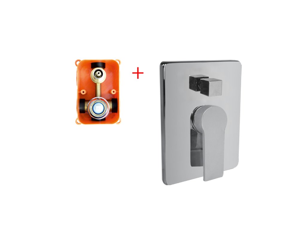Dvoucestná podomítková baterie s keramickým přepínačem, Mbox, hranatý kryt, vývod s držákem sprchy, rameno ze zdi 330 mm, nerezová talířová sprcha slim 300x200 mm, nerezová dvouzámková hadice 150 cm, jednopolohová ruční sprcha.10 let záruka na baterii.