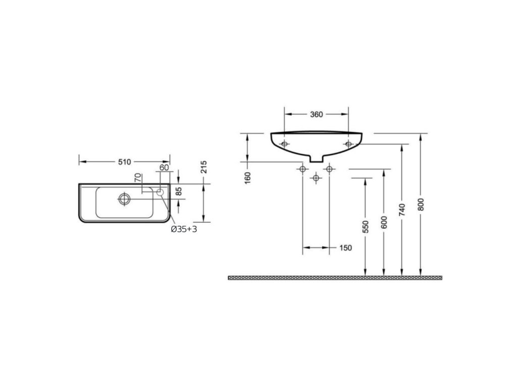 Keramické umývátko s otvorem na baterii pouze na pravé straně a s přepadem. Možnosti instalace na zavěšení.Umyvadlo se dodává bez upevňovacích šroubů.