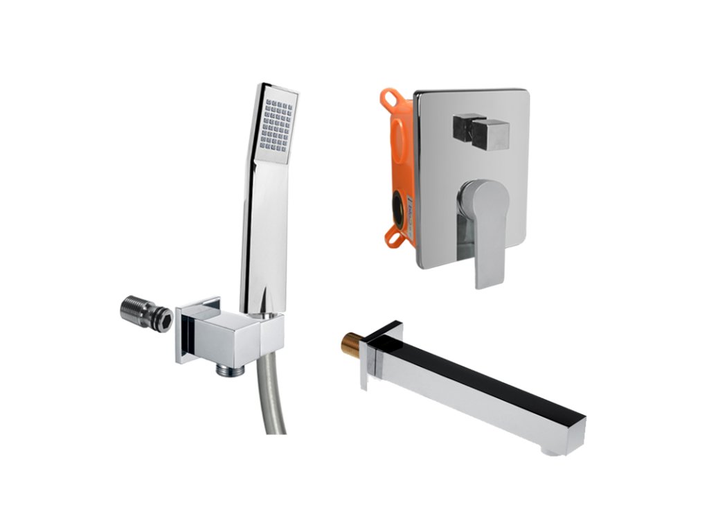 Dvoucestná podomítková baterie s keramickým přepínačem, Mbox, hranatý kryt, vývod s držákem sprchy, šedostříbrná hadice 150 cm, jednopolohová ruční sprcha, vanové napouštěcí ramínko.10 let záruka na baterii.