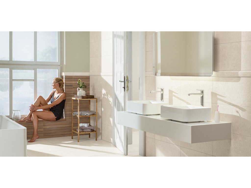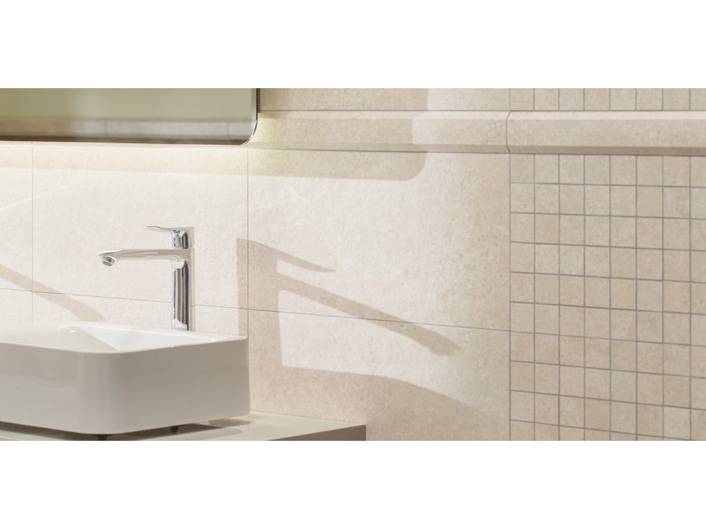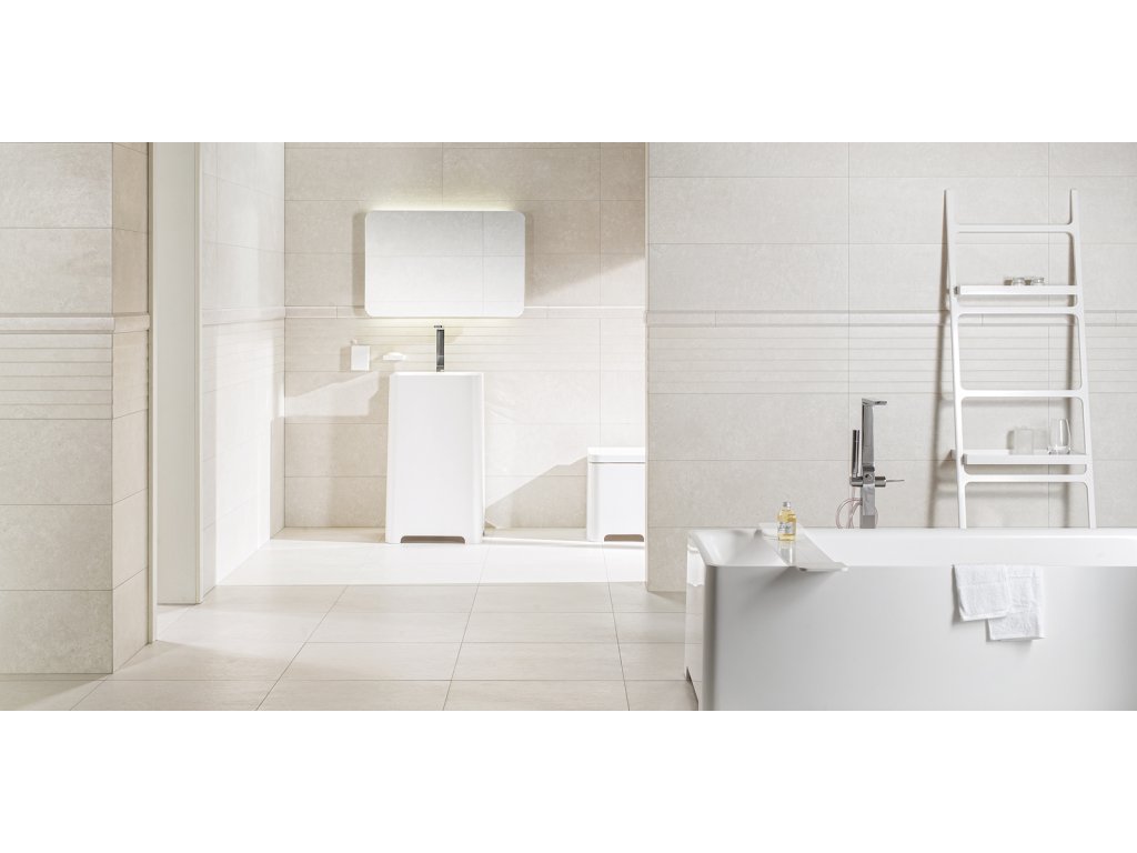Efekt kamenného povrchu série Base opticky podporuje matný přírodní reliéf. Rektifikované obkládačky 30 x 60 a 30 x 90 cm jsou v nabídce ve dvou barvách – slonová kost a světle béžová, vhodné ke kombinacím s rektifikovanými dlaždicemi stejného designu. Základní obkládačky doplňují tři typy dekorací. Zajímavou i funkční dekorací může být mozaika 5 x 5 cm (set 30 x 30 cm), reliéfní bordura 60 x 7 cm nebo výrazná reliéfní dekorace připomínající lamely (žaluzie) v designu kamene a dřeva.