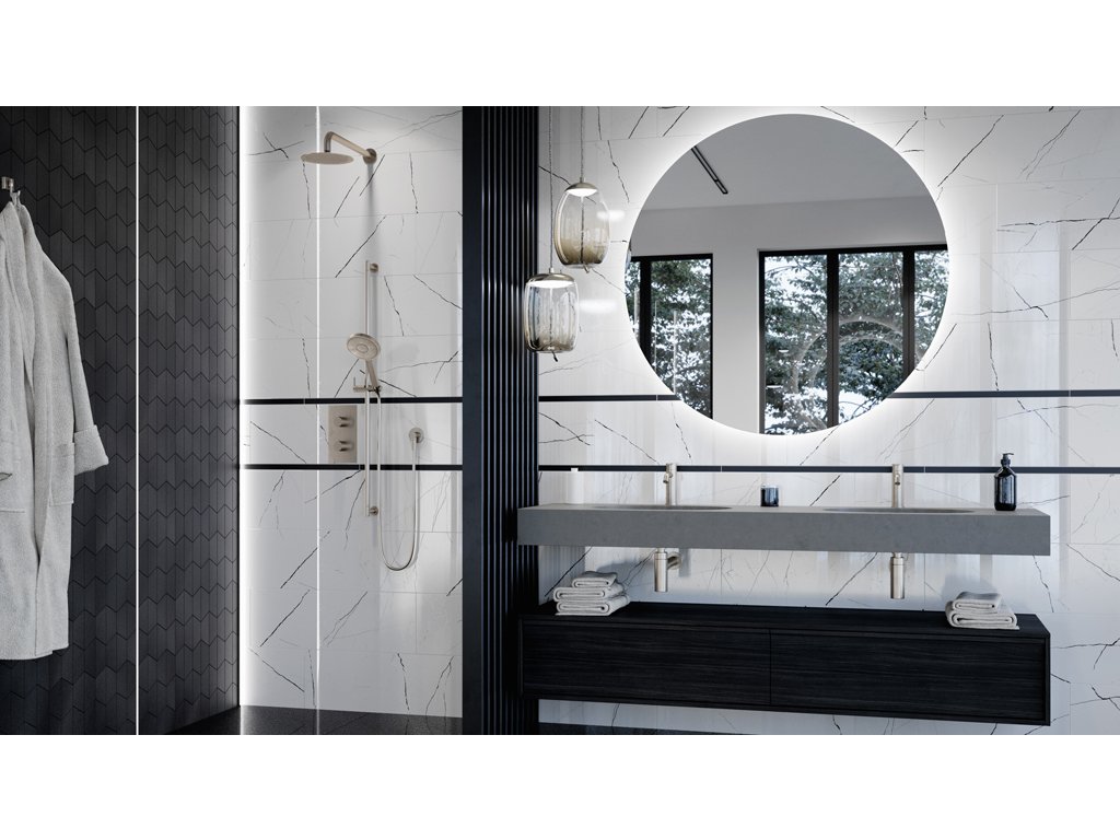 Jedná se o originální a nadčasovou kolekci stylizovaných obkladů z lesklého mramoru. Základní obklad je bílý, mramorový vzor je černý a kombinace syrovosti bílého mramoru s černým lemováním a geometrickou mozaikou dodává interiéru velmi moderní a osobitý vzhled. Dominantním trendem v interiéru je v poslední době používání keramických obkladů stylizovaných do podoby drahého kamene.