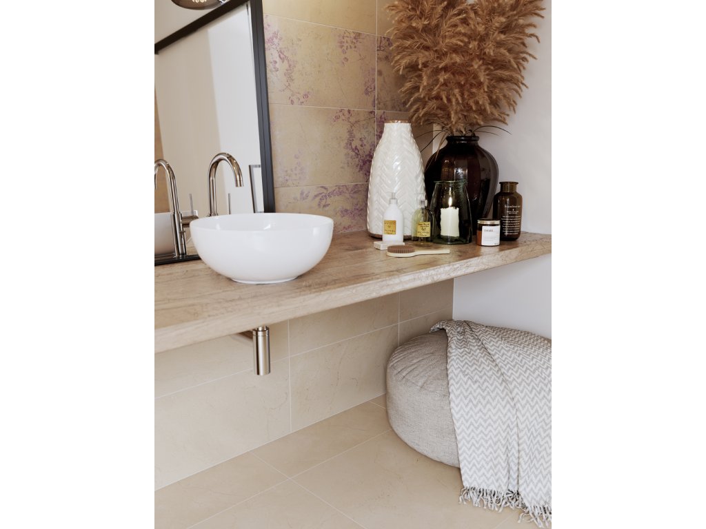 Povrch obkládaček vznikl harmonickým spojením jemného léty prověřeného mramorování s přednostmi novodobých postupů. S působivými výsledky: Díky moderním technologiím chráníme přírodu. Decentní mramorovaný design v béžových tónech má kombinace nerektifikovaných obkládaček 30 x 60 a 20 x 40 cm s dlaždicí formátu 60 x 60 cm. Květinové vzory na dekoracích 30 x 60 cm v jemných modrofialových barvách s využitím technologie DryFix, dodávají dekorované obkládačce strukturu a vytváří osobitý kontrast. K dispozici je řezaná (5 x 5 cm) i falešná mozaika 2,5 x 2,5 cm ve formátu 20 x 40 cm. Rektifikované dlaždice 60 x 60 cm ve stejném designu doplněné o schodovku a sokl zajistí řešení bez limitů.