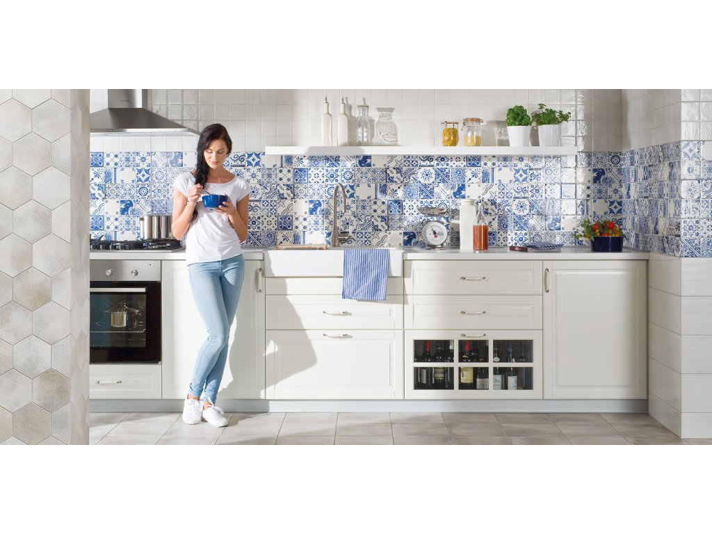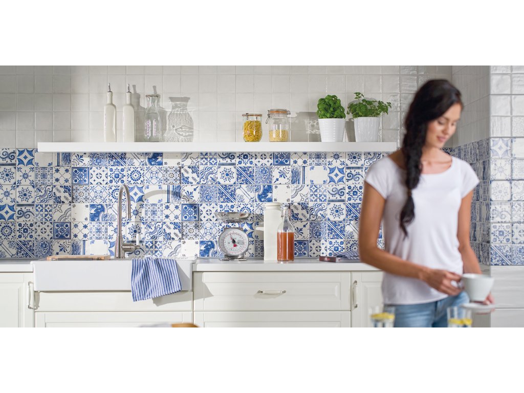 Obkládačka vytváří na první pohled iluzi klasické mozaiky, nicméně se jedná o celoplošnou dekoraci 20 x 60 cm ideální pro obkládání kuchyňských prostorů. Majolikové dekorace 20 x 60 cm tvoří vždy 12 stylových majolikových vzorů (10 x 10 cm), které se záměrně neopakují. Na podlahu se nabízí dlaždice Via, Board či Faro.