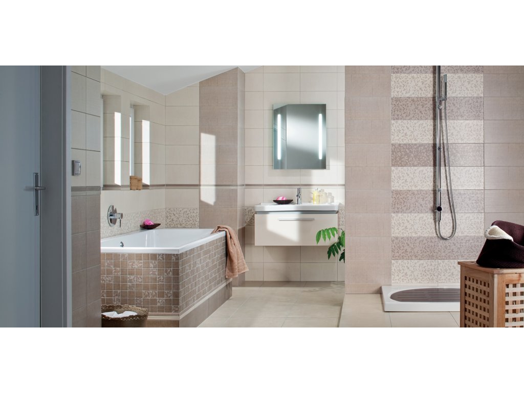 Textile je zhmotněním tradičního pojetí koupelny, ale i přesto dokáže koupelna oblečená do jemného květinového dekoru udržet krok s moderními trendy. Základní obkládačky 20 x 40 cm v harmonických přírodních odstínech se díky neutrální barevnosti vzájemně doplňují, originální povrch kopíruje strukturu hrubší tkané textilie. Série nabízí dvě varianty dekorací. První pro zákazníky dávající přednost klasickému, útulnému stylu a druhou pro příznivce elegantních koupelen s důrazem na zajímavý detail povrchu.