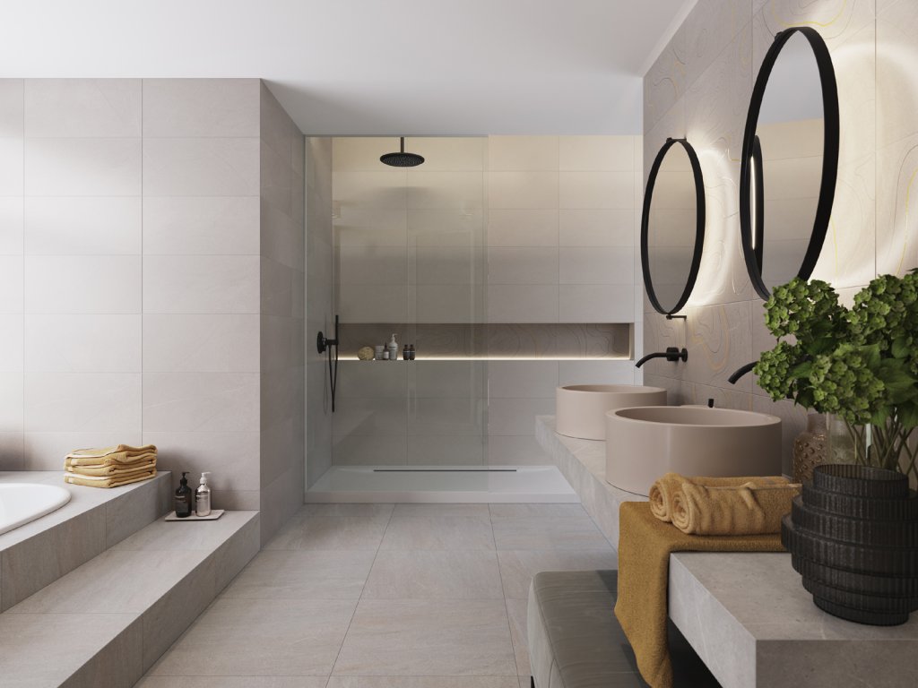Design pískovce v moderních šedých a béžových odstínech v matném provedení to je série Topo. Obkládačky 30 x 60 cm svou střídmostí podporují maximální kombinovatelnost s dlaždicemi ze série Quarzit 60 x 60 cm. Dekorace 30 x 60 cm s vyobrazenými vrstevnicemi, zvýrazněnými transparentním sklem, je vyrobena technologií DryFix. Ta umožňuje vytvořit jemný reliéf, který vytváří zajímavé světelné efekty a je v soutisku s vlastním designem. Řezaná mozaika 5 x 5 cm je k dispozici ve všech barevných provedeních. Obklady zkrátka ovládá propojení tradice se současností. Jde o spojení poctivého řemesla a průmyslových inovací.