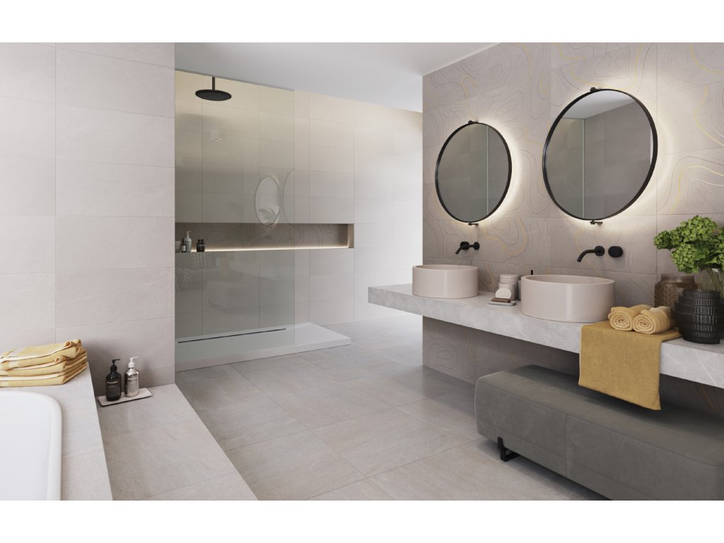 Design pískovce v moderních šedých a béžových odstínech v matném provedení to je série Topo. Obkládačky 30 x 60 cm svou střídmostí podporují maximální kombinovatelnost s dlaždicemi ze série Quarzit 60 x 60 cm. Dekorace 30 x 60 cm s vyobrazenými vrstevnicemi, zvýrazněnými transparentním sklem, je vyrobena technologií DryFix. Ta umožňuje vytvořit jemný reliéf, který vytváří zajímavé světelné efekty a je v soutisku s vlastním designem. Řezaná mozaika 5 x 5 cm je k dispozici ve všech barevných provedeních. Obklady zkrátka ovládá propojení tradice se současností. Jde o spojení poctivého řemesla a průmyslových inovací.