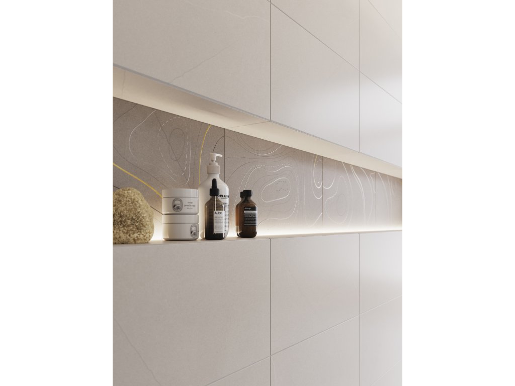 Design pískovce v moderních šedých a béžových odstínech v matném provedení to je série Topo. Obkládačky 30 x 60 cm svou střídmostí podporují maximální kombinovatelnost s dlaždicemi ze série Quarzit 60 x 60 cm. Dekorace 30 x 60 cm s vyobrazenými vrstevnicemi, zvýrazněnými transparentním sklem, je vyrobena technologií DryFix. Ta umožňuje vytvořit jemný reliéf, který vytváří zajímavé světelné efekty a je v soutisku s vlastním designem. Řezaná mozaika 5 x 5 cm je k dispozici ve všech barevných provedeních. Obklady zkrátka ovládá propojení tradice se současností. Jde o spojení poctivého řemesla a průmyslových inovací.