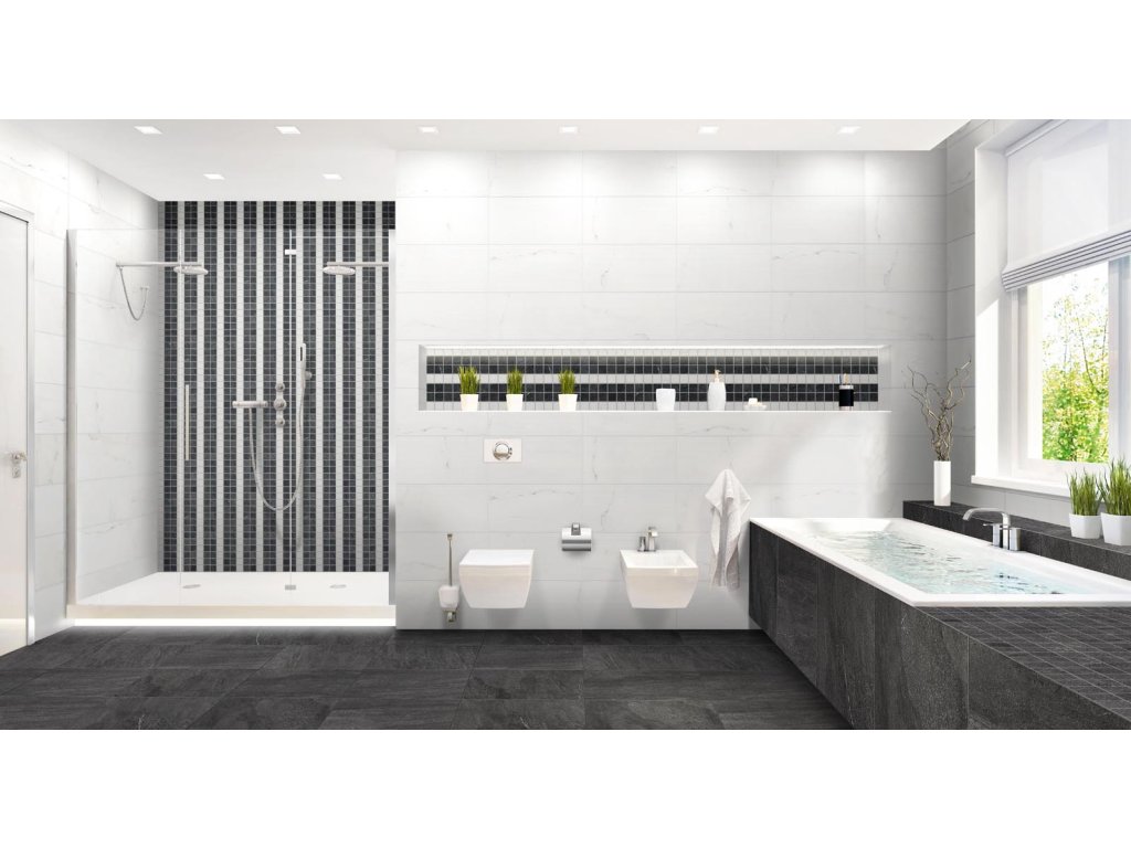 Vzhled carrarského mramoru v klasickém bílo-černém provedení dodávají rektifikované matné nebo lesklé obkládačky formátu 30 x 60 cm. Dokonalý vzhled kamene si v porovnání s originálem navíc zachovává výhody keramických výrobků – snadné čištění, mechanickou a chemickou odolnost, ekologickou nezávadnost atd. Pro dekorování větších ploch stěn jsou v nabídce obkládačky s jemným liniovým reliéfem nebo dvě varianty řezané mozaiky 5 x 5 cm. S mozaikami lze pracovat klasickým způsobem nebo je rozřezat a jejich následným pravidelným natáčením vytvořit dekorativní plochy, které zvýrazní exkluzivitu koupelny. Ke kombinování doporučujeme dlaždici Quarzit v černé barvě ve formátu 60 x 60 cm. Dlaždice jsou rektifikované na stejný modulový rozměr jako obkládačky Vein, což umožňuje dodržet stejnou velikost spáry u všech obkládaných ploch.