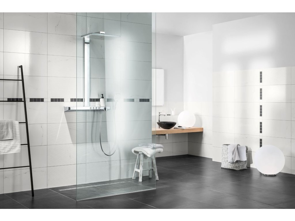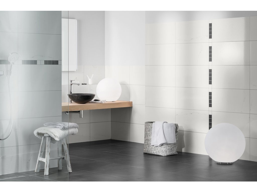 Vzhled carrarského mramoru v klasickém bílo-černém provedení dodávají rektifikované matné nebo lesklé obkládačky formátu 30 x 60 cm. Dokonalý vzhled kamene si v porovnání s originálem navíc zachovává výhody keramických výrobků – snadné čištění, mechanickou a chemickou odolnost, ekologickou nezávadnost atd. Pro dekorování větších ploch stěn jsou v nabídce obkládačky s jemným liniovým reliéfem nebo dvě varianty řezané mozaiky 5 x 5 cm. S mozaikami lze pracovat klasickým způsobem nebo je rozřezat a jejich následným pravidelným natáčením vytvořit dekorativní plochy, které zvýrazní exkluzivitu koupelny. Ke kombinování doporučujeme dlaždici Quarzit v černé barvě ve formátu 60 x 60 cm. Dlaždice jsou rektifikované na stejný modulový rozměr jako obkládačky Vein, což umožňuje dodržet stejnou velikost spáry u všech obkládaných ploch.
