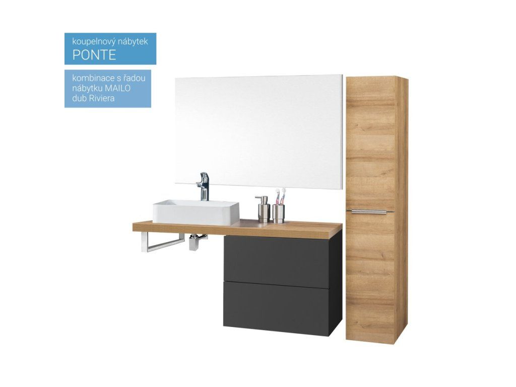 Série koupelnového nábytku Ponte umožňuje kombinovat skříňky a desky do různých variant. Umožňuje vytvořit kombinace do velkých koupelen i minimalistické řešení v moderním designu. Otevírání zásuvek je řešeno systémem push-open, tedy otevírání bez úchytek. Zásuvky jsou osazeny kvalitním německým kováním značky BLUM s pomalým dovíráním. Na výběr je mnoho barevných variant, Multidecor. Skříňky jsou dodávány ve smontovaném stavu a všechny jsou určeny k zavěšení.Doplňkové parametry