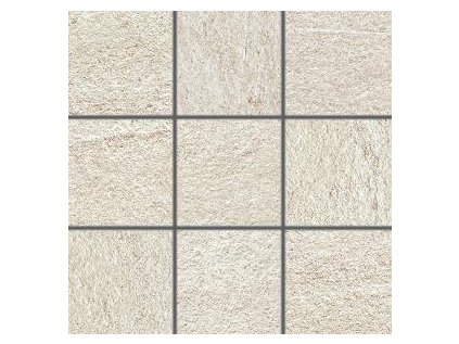 Dlažba RAKO v béžové a šedé barvě, rozměry 10x10 cm, tloušťka 10 mm, s reliéfním matným povrchem. Imitace kamene Quarzit, glazovaná s protiskluzností R 10, vhodná pro interiéry...