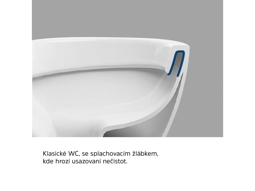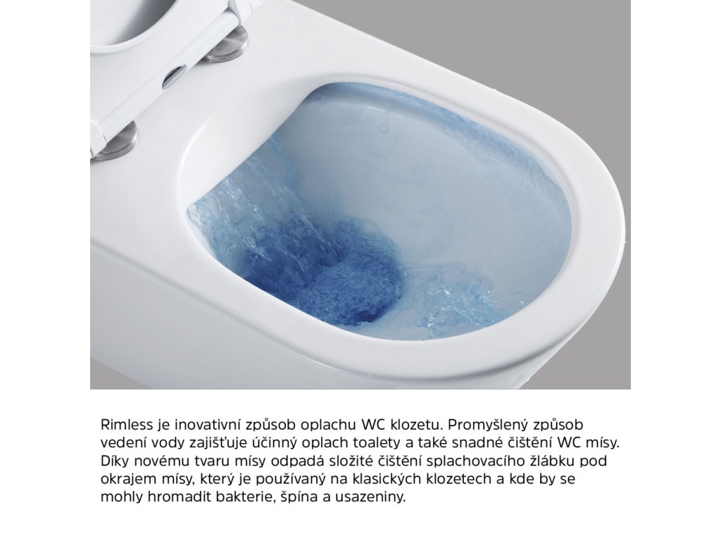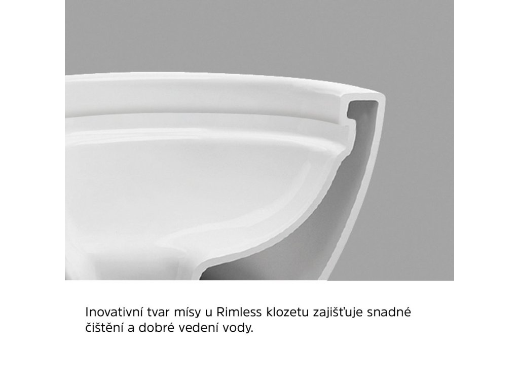 Rimless je inovativní způsob oplachu WC klozetu. Promyšlený způsob vedení vody zajišťuje účinný oplach toalety a také snadné čištění WC mísy.Díky novému tvaru mísy odpadá složité čištění splachovacího žlábku pod okrajem mísy, který je používaný na klasických klozetech, a kde by se mohly hromadit bakterie, špína a usazeniny.